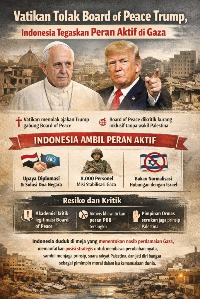 “Paus menolak ajakan Trump untuk Board of Peace, dewan internasional yang kontroversial. Indonesia, di sisi lain, menegaskan peran aktifnya di Gaza, memperjuangkan suara rakyat Palestina dan menjaga prinsip diplomasi bebas-aktif.”